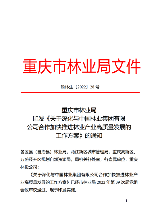 为认真落实中国林业集团与重庆市人民政府有关深化合作事宜,加快推进重庆林业产业高质量发展,近日,重庆市林业局印发《关于深化与中国林业集团有限公司合作加快推进林业产业高质量发展的工作方案》。