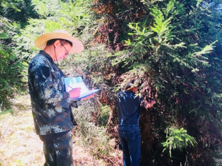 炎炎夏日,地表温度高达40°,他为了精准调查树种、林龄、胸径、经营现状等情况,头顶烈日,一走就是个把小时,每天步行超过两万步,脸和脖子被太阳晒得泛红、灼伤,甚至脱皮,他也没有一句怨言。
