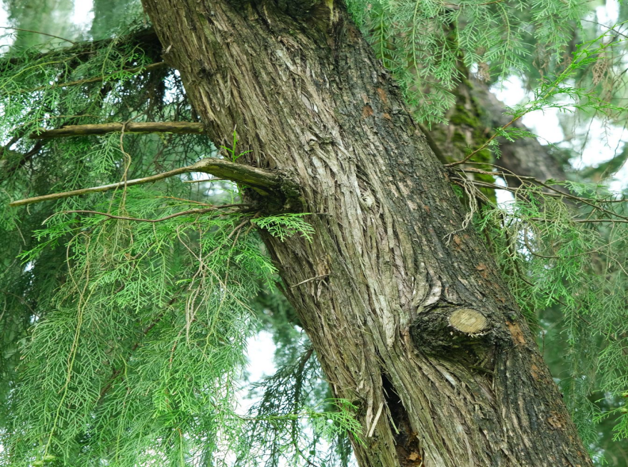 株高可达20米,树皮浅灰褐色,呈薄片状剥落;小枝扁平,排成平面,形似鱼鳞,四季常青;叶为鳞形,交互对生,紧密贴附在小枝上,颜色深绿有光泽;球果近卵形,成熟时呈红褐色,种鳞木质化,开裂后露出种子,辨识度极高。