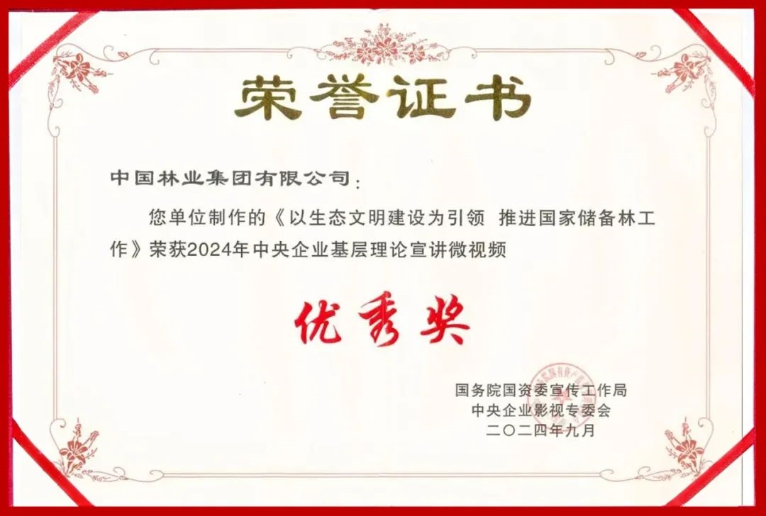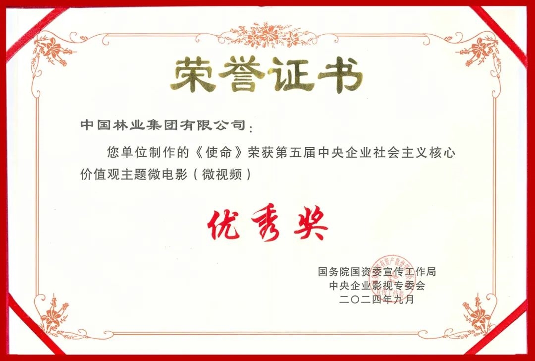 9月27日,在新中国75周年华诞到来之际,国务院国资委在京举行中央企业社会主义核心价值观主题微电影(微视频)展映发布活动。活动现场发布了初心使命、爱党报国、敬业奉献、社会责任等四个主题100部优秀作品以及中央企业基层理论宣讲100部优秀微视频。其中,中国林业集团选送的两部作品——《使命》荣获第五届中央企业社会主义核心价值观主题微电影(微视频)优秀奖;《以生态文明建设为引领 推进国家储备林工作》荣获2024年中央企业基层理论宣讲微视频优秀奖。