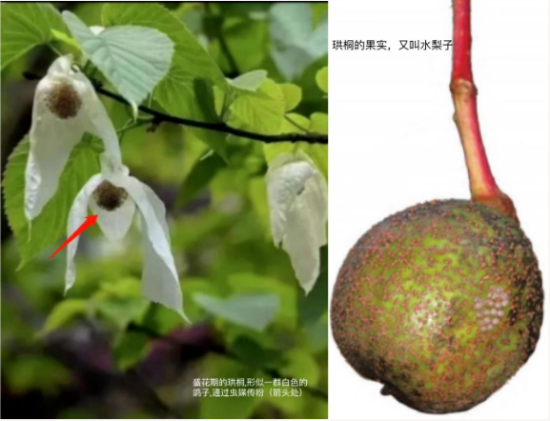 珙桐为落叶乔木,树高可达15-20米。叶片呈稍偏斜的倒心形,边缘有锯齿,先端骤尖, 有时候形成修长的尾尖,十分飘逸。珙桐每年从4月中旬到5月上中旬开花, 花期可长达5个月,珙桐开花时,远远看去像栖息了满树的白鸽子在风中展翅,因此有“鸽子树”之名。珙桐在10月份前后进入果期,果实呈棕色长卵圆形,果柄粗壮,一个个倒挂在树上,就像一个个褐色的小梨。叶子脱落后,果实还会宿存在树端,十分显眼,这便是珙桐“水梨子”一名的由来。