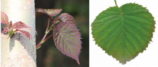 珙桐紫红色的新生叶                                                正面的绿色珙桐叶