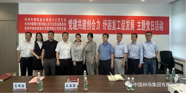 近日,中国林场所属徐州中林陆港城市发展有限公司党支部(下称“徐州中林”)与徐州市银保监分局第十三党支部、中国银行徐州泉山支行党总支,共同开展了“党建共建创合力,纾困复工促发展”主题党日活动。 徐州中林党支部书记王亚琴、常务副总马明国、徐州市银保监分局第十三党支部书记李俊、中国银行徐州泉山支行党总支书记姜涛出席活动。