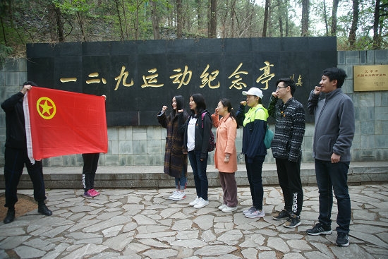 “一二九运动”纪念亭在植物园的深处,路途较远,地处山顶,春寒料峭,团员青年不畏寒冷,一路了解学习沿途植物与花卉,经过一个半小时的步行,团员青年们到达了屹立于植物园西北顶端的“一二九纪念亭”。大家对纪念亭系列建筑和文史资料进行了参观和学习,深刻领会了“一二九运动”的伟大历史意义,激发了青年人爱国热情,坚定了追求真理、追求进步的信念。之后,团员青年们在这里拍摄了纪念“五四运动100周年”,传承五四精神活动视频,集体重温了入团誓词,铮铮誓言在山林中回荡,大家仿佛感受到了革命先驱的爱国激情。